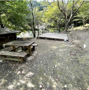 全4区画のテントサイトは、地面に直接ではなく「木製のスノコ」の上に設営するスタイルです。 スノコのサイズは最小で3.7m×4.0mと非常に限定的で、大型の2ルームテントや大きなタープを十分に張るスペースはありません。 各サイトには木製のベンチ付きテーブルが付属しており便利ですが、持参するテントのサイズには細心の注意が必要です。