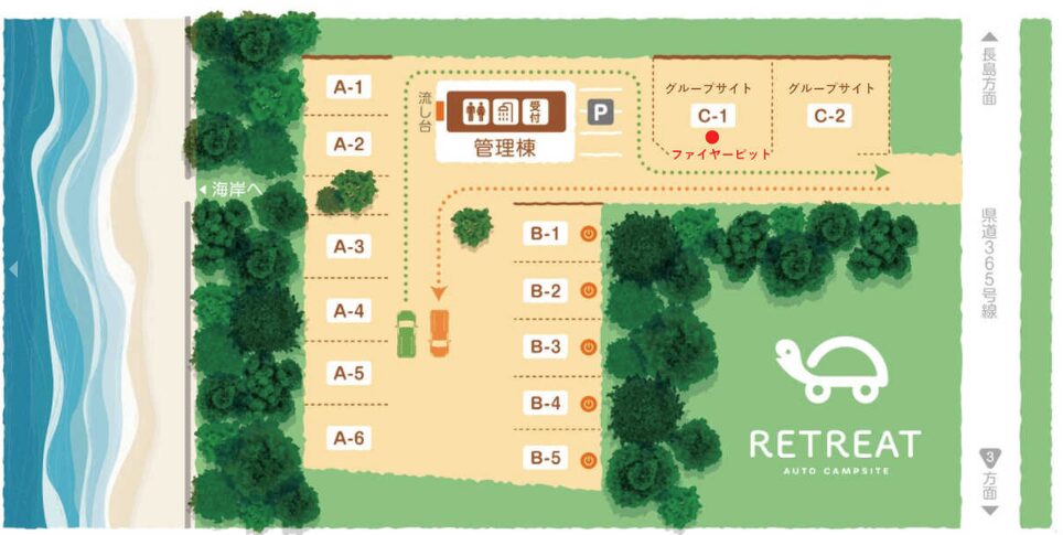 全2区画。最大15名まで利用可能な広々としたサイト。特にC-1サイトにはキャンプ場内で唯一、直火が可能なファイヤーピットが常設されており、大人数で炎を囲む特別な体験ができます。