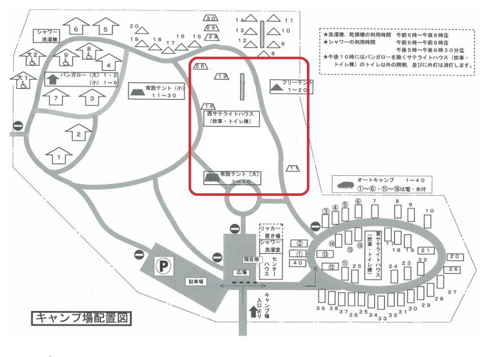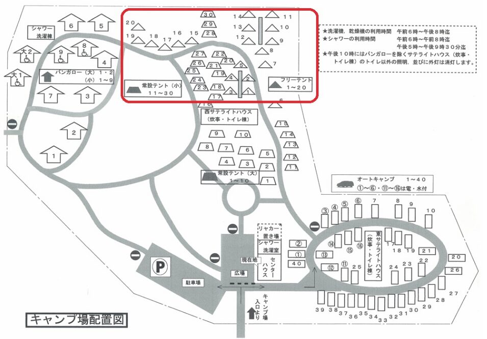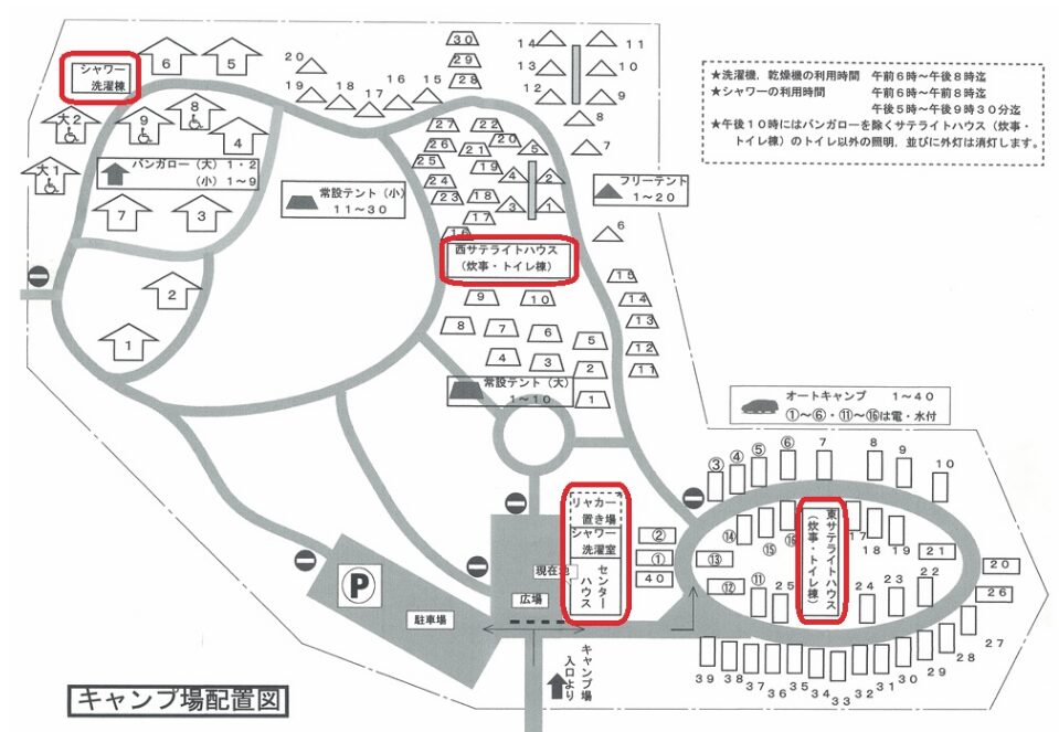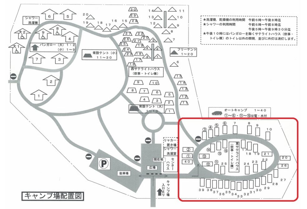 全40区画。車の横付けが可能で、うち12区画はAC電源と水道も完備。テーブルとベンチが常設されており、利便性が高いです。