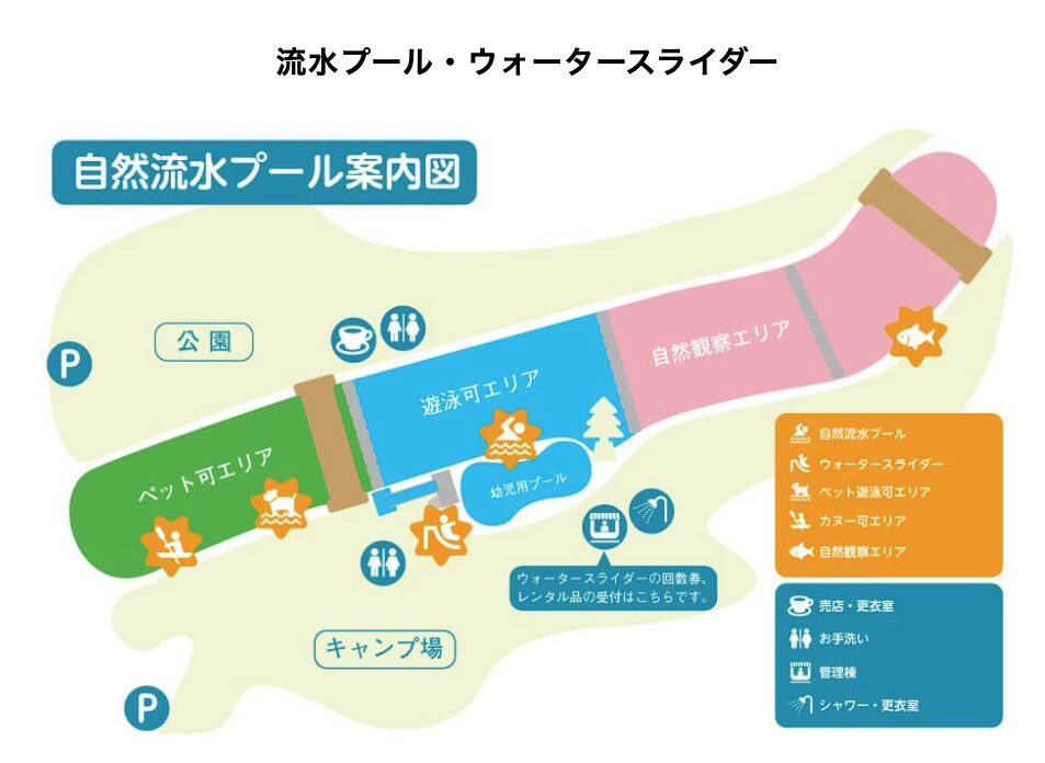 夏休み期間中は天然流水プールとウォータースライダーが開放されます。