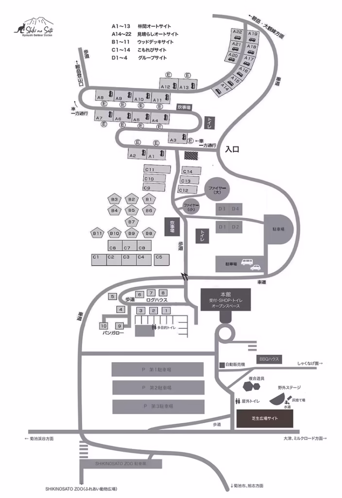 あり(薪、炭、キャンプギアなどを販売)。アウトドアショップ「シェルパ」が併設。