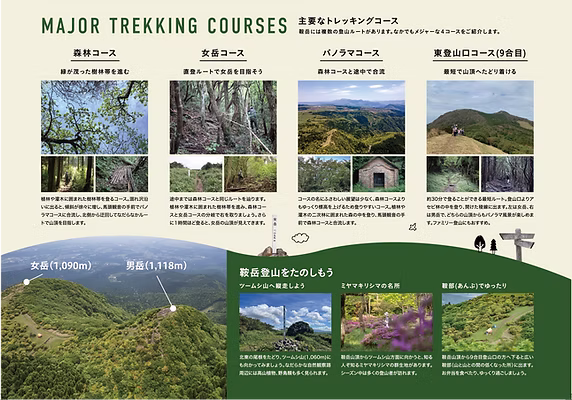 阿蘇北外輪山のひとつである鞍岳(標高1,118m)の登山口が近く、山頂からは360°パノラマが広がり、阿蘇五岳から雲仙普賢岳まで一望できます。九州百名山のひとつで、全国遊歩百選にも選ばれています。